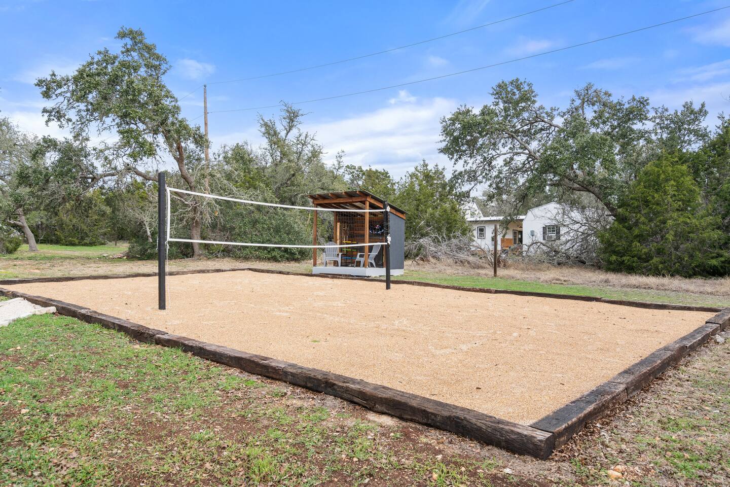 This thoughtfully designed tiny home features a spacious one-bedroom with a plush king-size bed, ensuring a restful night’s sleep. The cozy living area includes a comfortable pull-out queen-size bed, accommodating up to four guests. Enjoy the convenience of a fully equipped kitchen, perfect for preparing meals during your stay. Step outside to unwind on the large deck, complete with inviting outdoor seating and a dining area. Relax in your private hot tub under the stars, or gather around the sand volleyball court for some friendly competition. Kids will love the playground, making this a great spot for family fun.